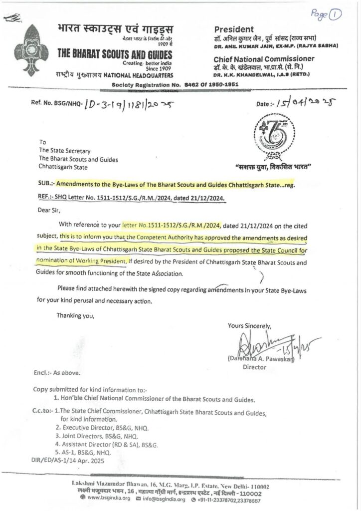 इस संशोधन के अनुमोदन करने के लिए 21.12.2024 को भारत स्काउट्स एंड गाइड्स छत्तीसगढ़ ने राष्ट्रीय मुख्यालय को पत्र लिखा था। जिसके जवाब में 15.04.2025 को एक पत्र के माध्यम से राष्ट्रीय मुख्यालय ने सक्षम अधिकारी द्वारा सभी संशोधन को स्वीकृति देकर अनुमोदित करने की जानकारी दी थी।
